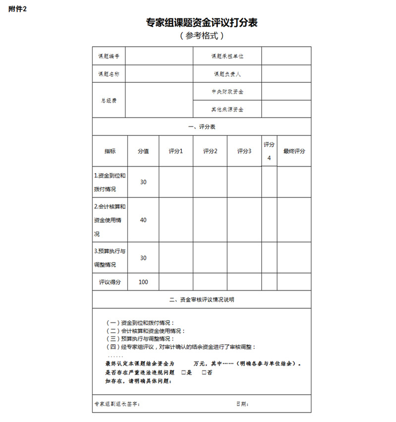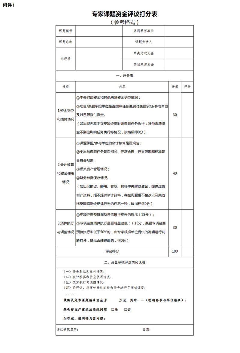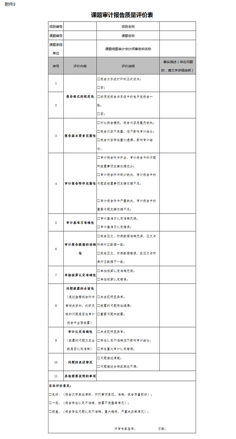 开展项目综合绩效评价时,由财务专家填写专家个人、专家组课题资金评议打分表(见附件1、2)。同时,为进一步加强对会计师事务所审计质量评价,财务专家应填写课题审计报告质量评价表(见附件3)。