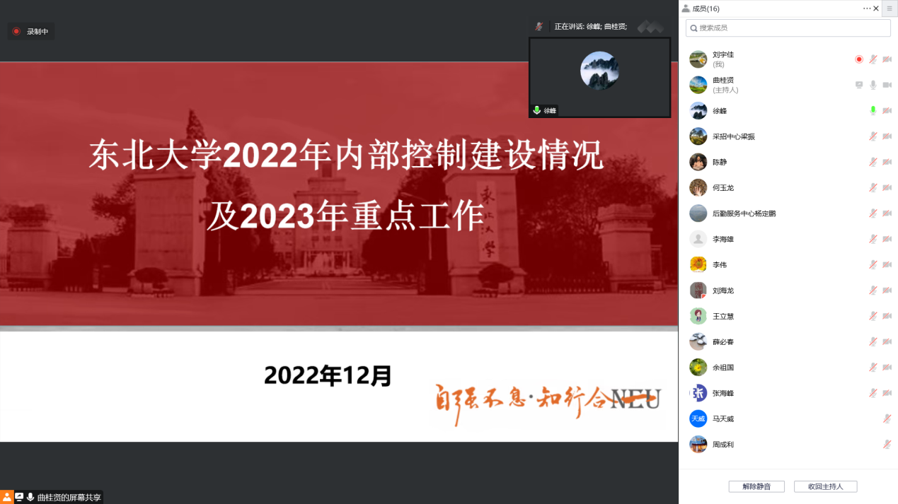 2022年12月23日,东北大学内部控制建设工作会以腾讯线上会议方式召开,学校党委常委、副校长徐峰以及相关职能部门负责人参加会议,会议由徐峰主持。