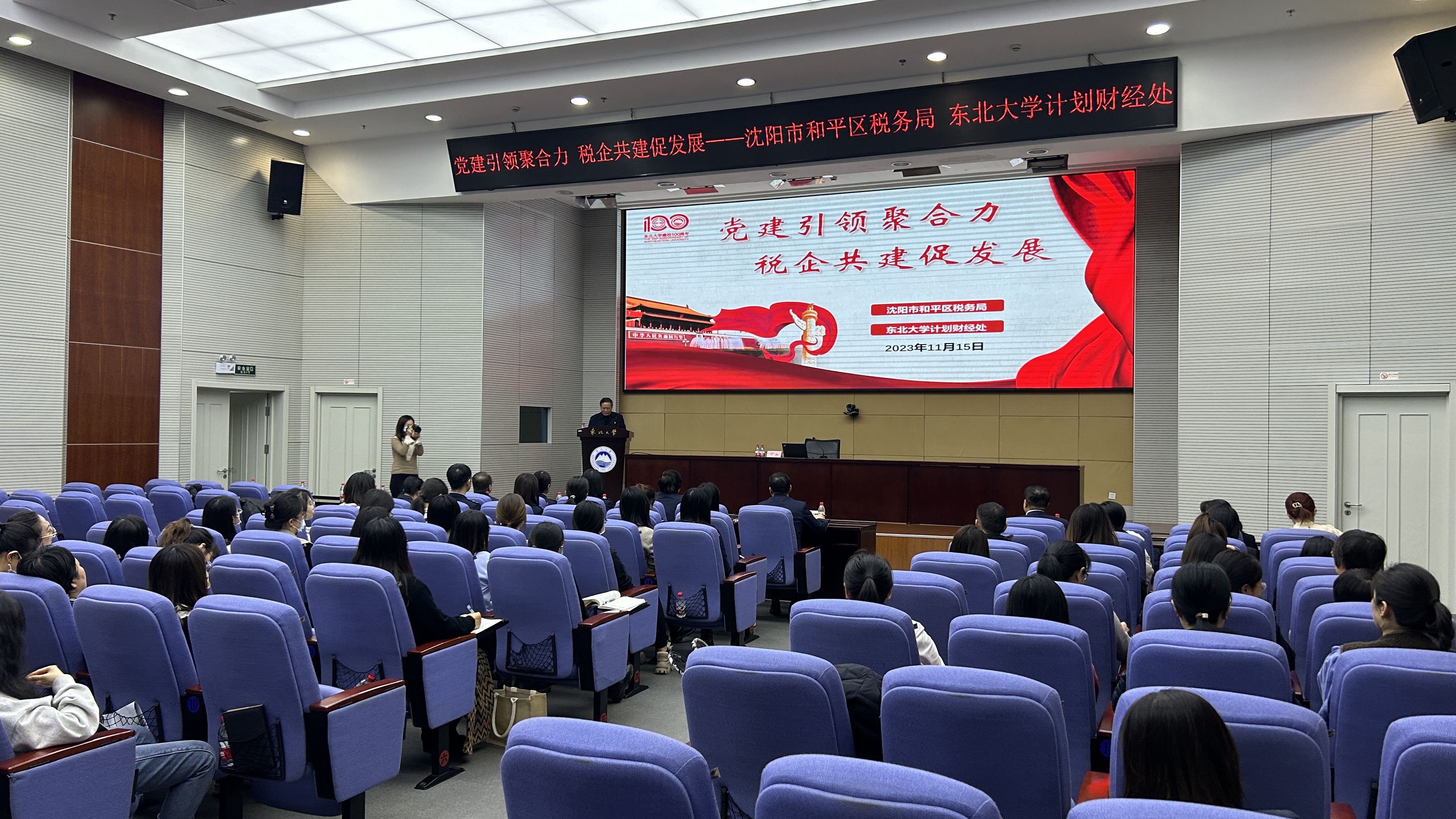 2023年11月15日,计划财经处与沈阳市和平区税务局联合开展“党建引领聚合力 税企共建促发展”主题党日活动,马克思主义学院副院长任鹏教授作题为《正确理解和大力推进中国式现代化》报告。沈阳市和平区税务局副局长王筱宁出席活动,计财处全体员工、和平区税务局税源管理一科党支部、货物与劳务税科党支部参加活动。活动由计财处副处长周斌主持。