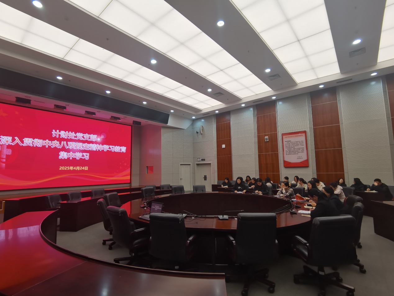 4月24日下午,计财处党支部在主楼824会议室开展深入贯彻中央八项规定精神学习教育,会议由党支部书记曲桂贤主持,计财处全体党员参加会议。