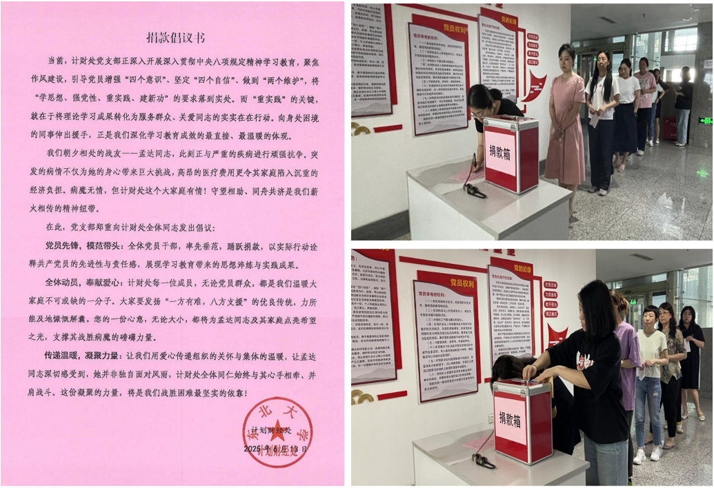 为切实帮助解决职工实际困难,传递组织温暖,6月13日,计财处党支部发起捐款倡议,为身患重病的孟达同志筹集医疗救助金。